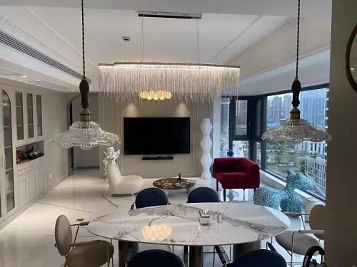 Very unique, and beautiful chandelier. It definitely adds a pop, and a focal point in your room.