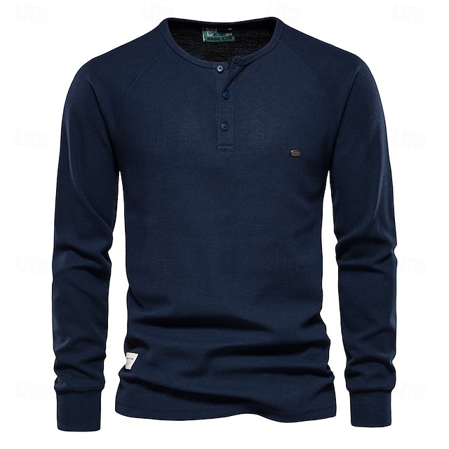 Men's Cotton Waffle Shirt Henley School Training Long Sleeve Button Clothing Apparel Elegant Warm Active Vintage