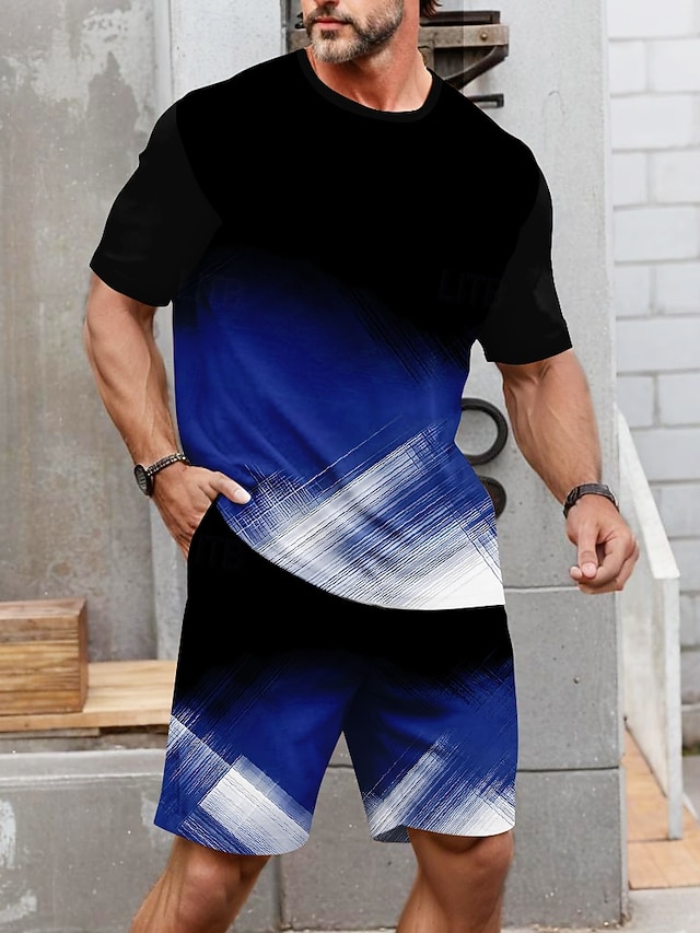 Men's Geometic Line 2pcs Tees sets Summer Tops Short Sleeve Short Pants Crew Neck Sport Casual Outdoor Vacation Sport 3D Print Summer Robin's Egg Blue White Red