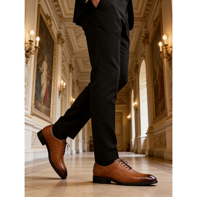Men's Cognac Crocodile Pattern Leather Lace-Up Oxfords - Sophisticated Footwear for Business Professionals