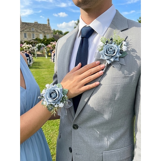 Men's Wedding Boutonniere and Wrist Corsage Set in Dusty Blue Light Blue Faux Floral Polyester Fabric for Grooms, Prom, Party & Evening Formal Occasions