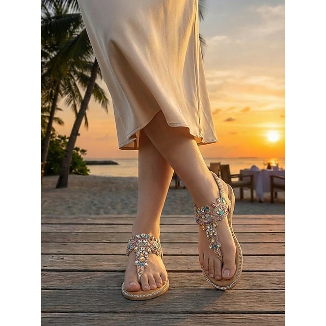 Women's Embellished Flat T-Strap Sandals - Elegant Resort Evening Shoes for Vacation Dinners