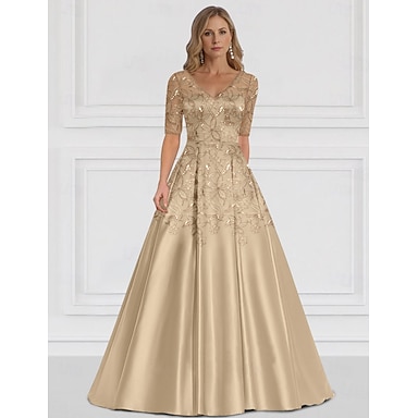 Corte A Hasta el Suelo Bordado con cuentas Vestido Invitada Boda Vestido formal Vestido de Madrina Media Manga Escote en Pico Elegante Sencillo Formal Invitado a la boda Satén con Encaje