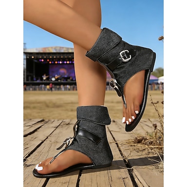 Sandalias bohemias con hebilla negra para mujer: elegante calzado de festival con correas ajustables, perfecto para festivales de música al aire libre, eventos de verano y días informales.
