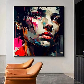 Arte contemporáneo pintado a mano de retrato de rostro de mujer, pintura al óleo hecha a mano, lienzo enrollado abstracto moderno (sin marco)