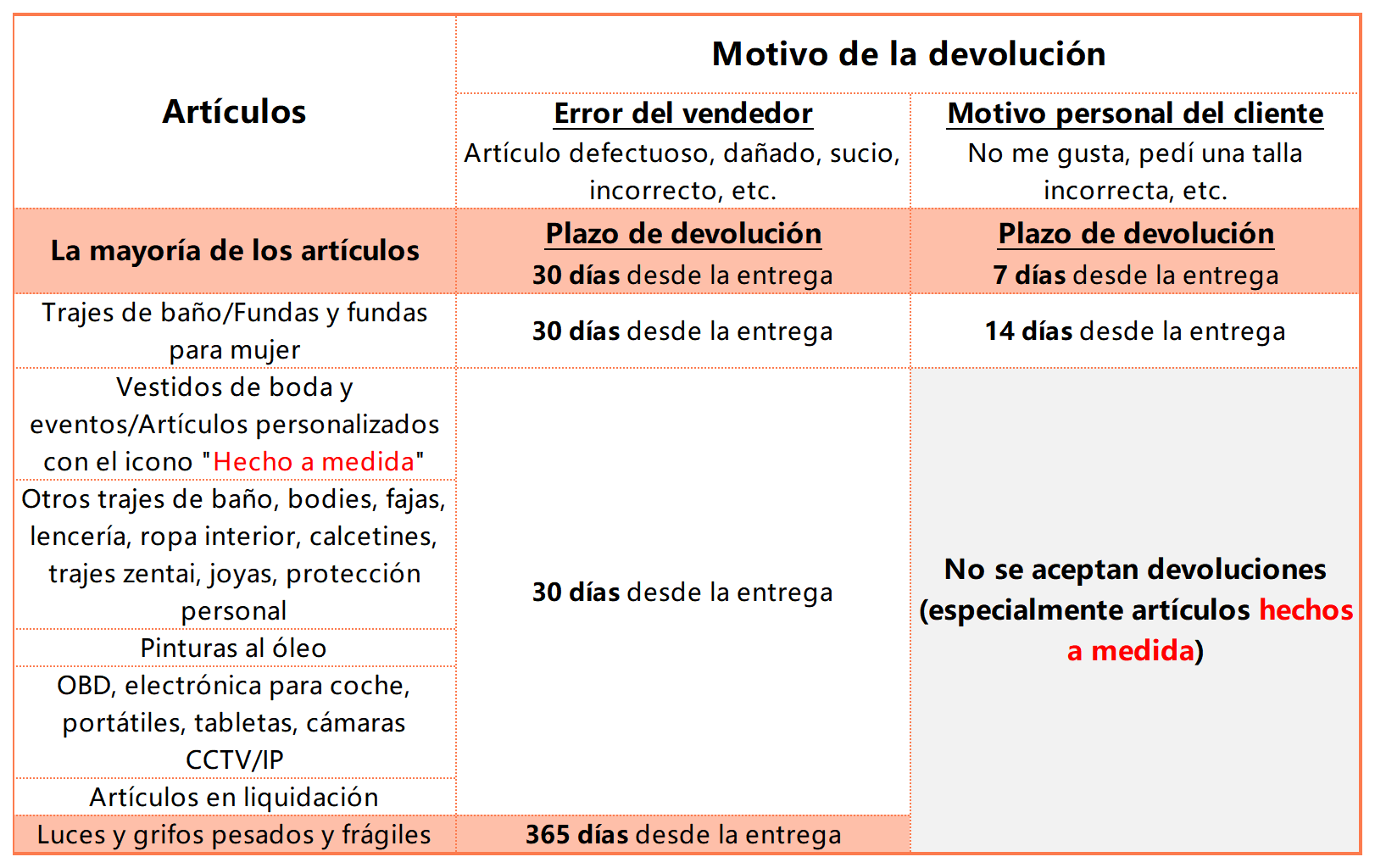 Excepto algunos productos hechos a medida, personalizados o especiales según lo requieran las leyes estatutarias aplicables en sus países o regiones locales, la gran mayoría de los productos pueden ser devueltos. Sin embargo, las condiciones específicas varían dependiendo del motivo de la devolución y el tipo de producto. Por favor, consulte la tabla a continuación para más detalles.