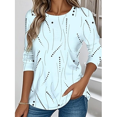 Camiseta de mujer de manga larga con escote redondo largo túnica gráfica geométrica elegante vintage estilosa regular tops diarios estampado amarillo rosa azul preotoño