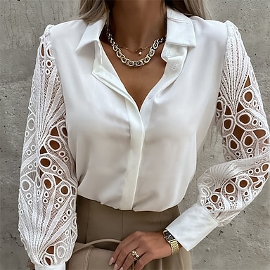 Mujer Camisa Camisa de encaje Blusa Parte superior con ojales Retazos Agujero Color sólido/liso Elegante Moda Diario Cuello Camisero Oficina Calle Noche Negro Blanco Primavera & Otoño Otoño invierno