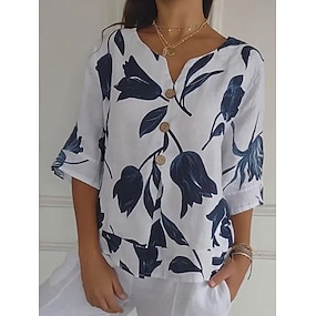 Mujer Camisa Abotonar Blusa Lino de algodón sintético Botones Estampado Graphic Elegante Diario Retro Antiguo Manga 3/4 Escote en Pico Tops regulares Diario Festivos Noche Blanco Rosa Rojo Verde