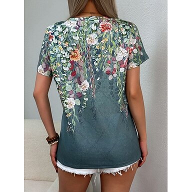 Mujer Camiseta Estampado Floral Graphic Vintage Elegante Clásico Manga Corta Escote en Pico Tops regulares Diario Ceniza Negro Verde Claro Rojo Verde Trébol Verano Primavera