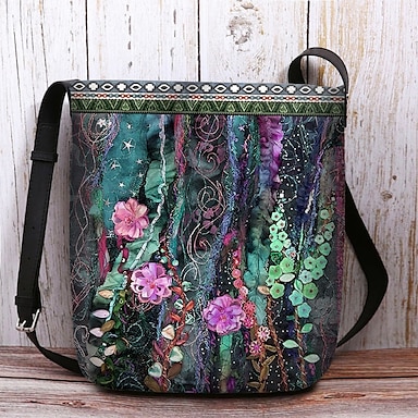 Bolso bandolera con bordado floral bohemio para mujer, bolso de hombro artístico hecho a mano con diseño de flores de colores, perfecto para uso informal y festivo.