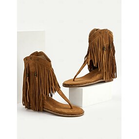 Sandalias de tobillo con flecos marrones estilo bohemio para mujer: un calzado moderno y fluido para festivales de música, paseos por la playa y reuniones informales al aire libre.