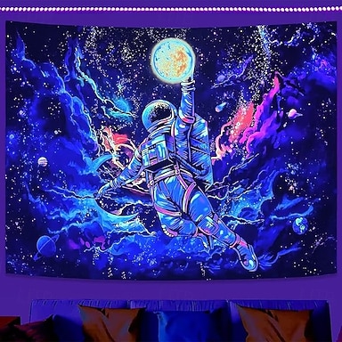 Tapiz de luz negra Brilla en la oscuridad Fiesta de luz UV Reactivo Planeta Universo Astronauta Trippy Paísaje de naturaleza brumosa Tapiz colgante Arte de pared Murales para Sala de estar Dormitorio