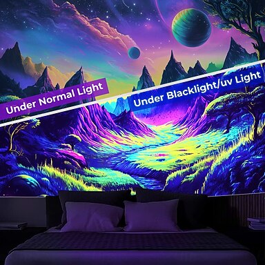 Tapiz de luz negra que brilla en la oscuridad fiesta luminosa UV reactivo psicodélico neblinoso paisaje natural de montaña tapiz colgante arte mural para sala de estar y dormitorio
