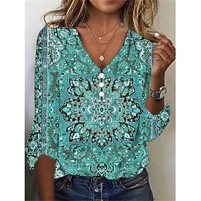 Mujer Camiseta Henley Shirt Floral Cosecha Étnico Diario Básico Manga 3/4 Escote en Pico Tops regulares Festivos Fin de semana Botones Estampado Rojo Morado Verde Trébol Caqui Gris Otoño invierno