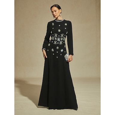Mujer Vestido maxi Vestido tubo Elegante Formal Vestidos semi formales Fiesta de Noche Lentejuelas Encaje Ajuste regular Floral Manga Larga Cuello Barco Negro