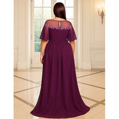 Corte A Hasta el Suelo Vestido formal Vestido de noche Manga Corta Hombros Caídos Elegante Vintage Talla Grande Poliéster Vestido de Madrina con Lentejuela
