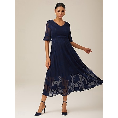 Mujer Longitud del té Vestido de raso Elegante Fiesta Color sólido Media Manga Escote en Pico Negro