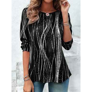 Naisten T-paita Painettu Kuvitettu Geometrinen Raidoitettu Vintage Muoti Tyylikäs Pitkähihainen Tiukka pyöreä kaula-aukko Pyöreä kaula-aukko Tavalliset topit Päivittäin Valkoinen / sininen Vaalean