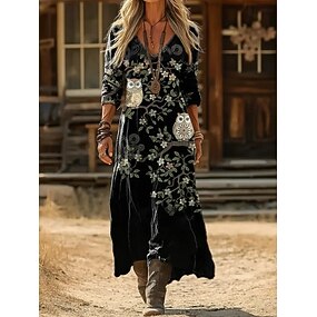 Naisten Maksimekko Väljä mekko Loma Vapaa-aika Boheemi ulko- Hiekkaranta Bile Loose Fit Kukka Kuvitettu Pitkähihainen V kaula-aukko Harmaa vihreä Musta Vaalean ruskea Kesä Kevät