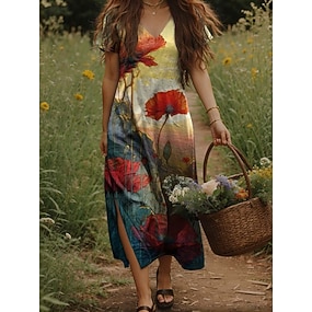 Naisten Maksimekko Rento mekko A linjainen mekko Böömi Loma Vintage Loma Päivittäin Normaali Kukka Lyhythihainen V kaula-aukko Keltainen Purppura Beesi Kesä Kevät