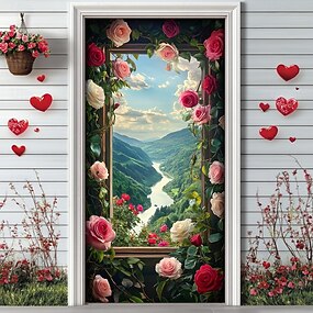 Häiden Ulkokoristeet Oven Peitteet Oven Tapestri Oven Verho Koriste Taustaelementti Sisä-/Ulkokäyttöön Oven Bandereet Etuovi Maalaistalo Ikkunanäkymä Ruusut