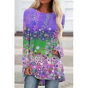 Naisille Plus-koko T-paita Tunika T-paidat Kukallinen Graafinen 3D Tunika Perus Neon Kirkas Pitkähiha Pyöreä pääntie Pitkät Paidat Päivittäin Viikonloppu Printti Vaaleanpunainen Sininen Violetti