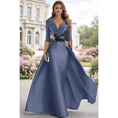 A-linja Kokopitkä Iltapuku Tyylikäs 3/4 hiha Paitapuserokaula-aukko Muodollinen Satiini kanssa Applikaatiot