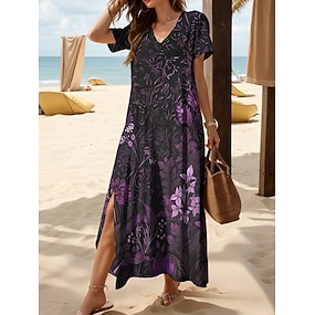 Naisten Maksimekko Neulosmekko Rento mekko Kesämekko A linjainen mekko Tyylikäs Loma Vapaa-aika Hiekkaranta Normaali Kukka Kuvitettu Lehti Lyhythihainen V kaula-aukko Rubiini Sininen Purppura Apila