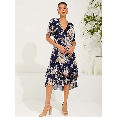 Naisten Teen pituus Sifonki Mekko Tyylikäs Levenevä hiha Loma Päivittäin Deitti Normaali Kukka Lyhythihainen V kaula-aukko Tumman sininen Kesä