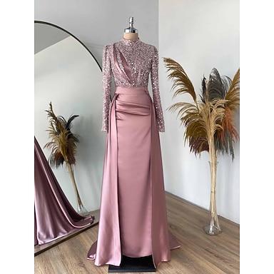 Tuubi Hipaisulaahus Iltapuku Tanssiaispuku hameen päällä Muodollinen mekko Tyylikäs Kimmaltava ja hohtava Pitkähihainen Pyöreä Muodollinen Satiini Paljetein koristeltu kanssa Laskokset Rypytetty