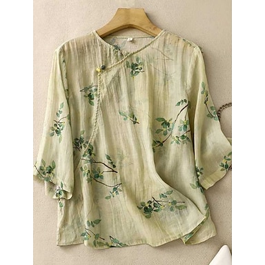 Naisten pellavan kaltainen tekokuituinen liinakangas paidat napit printti kukkakuosi rento 3/4-pituiset hihat pyöreä pääntie säännölliset yläosat päivittäinen keltainen vaaleanpunainen vihreä kesä