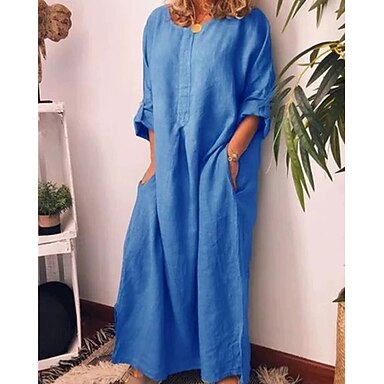 Naisten Pitkä mekko Maxi mekko Cotton Blend Väljä mekko Rento mekko Tyylikäs Vapaa-aika Päivittäin Loma Deitti Normaali Tavallinen Pitkähihainen Tiukka pyöreä kaula-aukko Sininen Valkoinen Keltainen