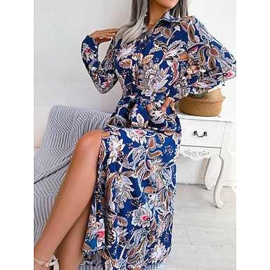 Naisten Maksimekko Rento mekko A linjainen mekko Boho-mekko Böömi Tyylikäs Vapaa-aika Loma Päivittäin Normaali Paisley-kuvio Pitkähihainen Paitapuserokaula-aukko Valkoinen Kuninkaallinen sininen