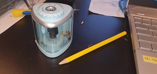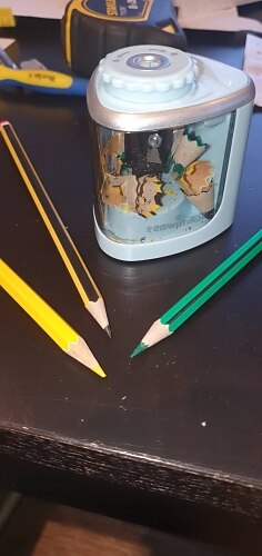 Fantastic sharpener for Primary School Teacher. Sharpens to a fine point in seconds. Takes 2 AA batteries and comes with a replacement blade too!