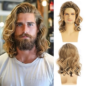 Miesten pitkät kiharat ruskeat peruukit synteettiset hiukset 70-luvun 80-luvun rokkari cosplay-asu halloween-juhlaparien peruukit