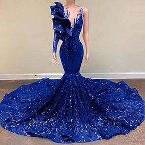Mermaid Trumpet Court Train Prom Dresses Evening Gown Ball Gown Formal Dress Elegant Sparkle & Shine Long Sleeve One Shoulder Engagement Formal Evening Sequined with Sequin