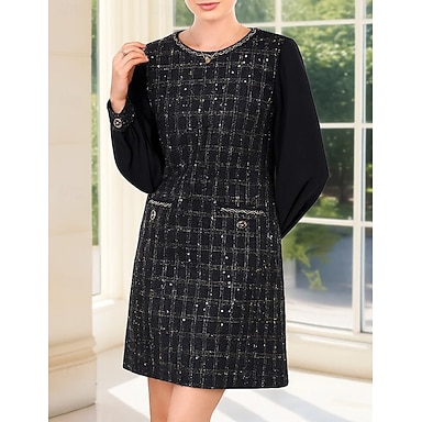 Robe fourreau colonne longueur genou Robe de fête Robe de cocktail Robe de convive de mariage Robe de mère de la mariée à manches longues encolure ras du cou élégante vintage en mélange de coton avec