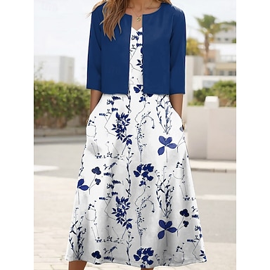 Ensemble de robes pour femmes en deux pièces robe midi avec veste élégante robe en A manches mi-longues robe décontractée imprimé floral encolure ras du cou rendez-vous rose bleue violette coupe