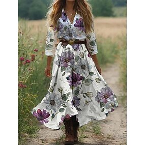 Femmes Robe maxi Robe bohème Robe Vintage Robe Décontractée ancien Coupe Ample Fleuri manche longue Col en V Noir et Blanc Glace bleue Noir Jaune Été Printemps