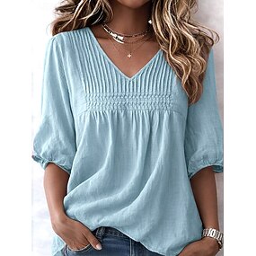Femmes Chemise Chemises en coton et lin Chemise en lin Uni Quotidien Élégant Basique Manche 3/4 Manches Bouffantes Col en V Hauts Réguliers Quotidien Travail Fête Bleu Noir Kaki Printemps Automne
