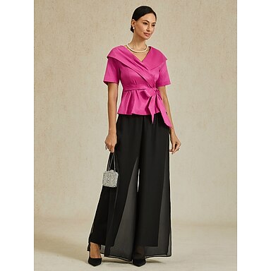 Femmes Chemisier Hauts de soirée Nœud devant Élégant Métallique Moderne Manche 3/4 Col en V Hauts Réguliers Soirée robe demoiselle d honneur Semi-Formel Rose ensoleillée Printemps, Automne, Hiver, Été