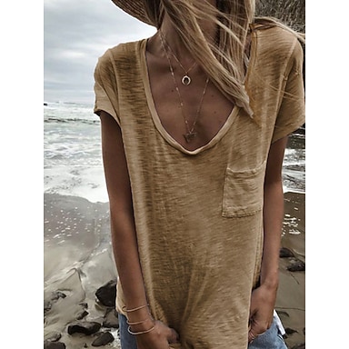 Femmes T-shirt Uni Basique Manche Courte Col en V Hauts Réguliers Occasionnel Week-end Avec Poches Blanche Rouge Bleu Roi Kaki Gris