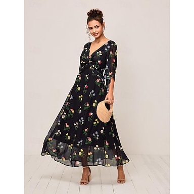 Femmes Robe maxi Robe trapèze Élégant Manche Évasée robe demoiselle d honneur Quotidien Cocktail Coupe régulière Fleuri Manche 3/4 Col en V Noir Été Automne