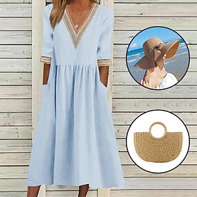 Femme Ensembles assortis Robe en lin Robe casual Robe en coton et lin Chapeaux Sac Tenues 3 pièces Moderne Décontractées Plein Vacances Manche Courte Eté Printemps Col V Patchwork