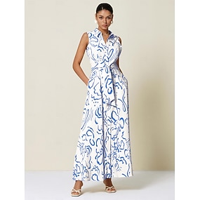 Femmes Robe Chemise Robe maxi Bleu Vert Beige Sans manches Courbe Avec Poches Impression Avec ceinture Été Col de chemise Ligne A XS S M