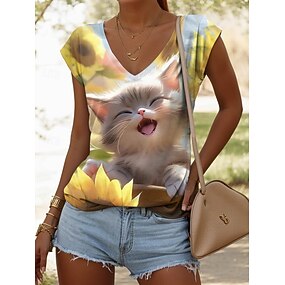 Femmes T-shirt Imprimé Graphique Animal Élégant Occasionnel Sans manches Col en V Hauts Réguliers Quotidien Sortir Week-end Bleu Noir Blanche Vert Gris Été Printemps