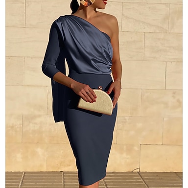 Fourreau Colonne Mi-long Robes de Cocktail Robes de soirée Élégant ancien Fête Manche 3/4 Une Épaule robe demoiselle d honneur Cocktail Tissu Extensible avec Drapé