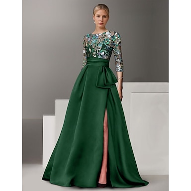 Robe de soirée florale en A brodée robe élégante mariage formel longueur de sol à manches demi-col en satin avec fente