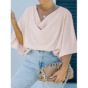 Chemisier en satin pour femme, haut élégant, blouse soyeuse bleue, noire et blanche, col en V, couleur unie, froncée, mode de tous les jours.